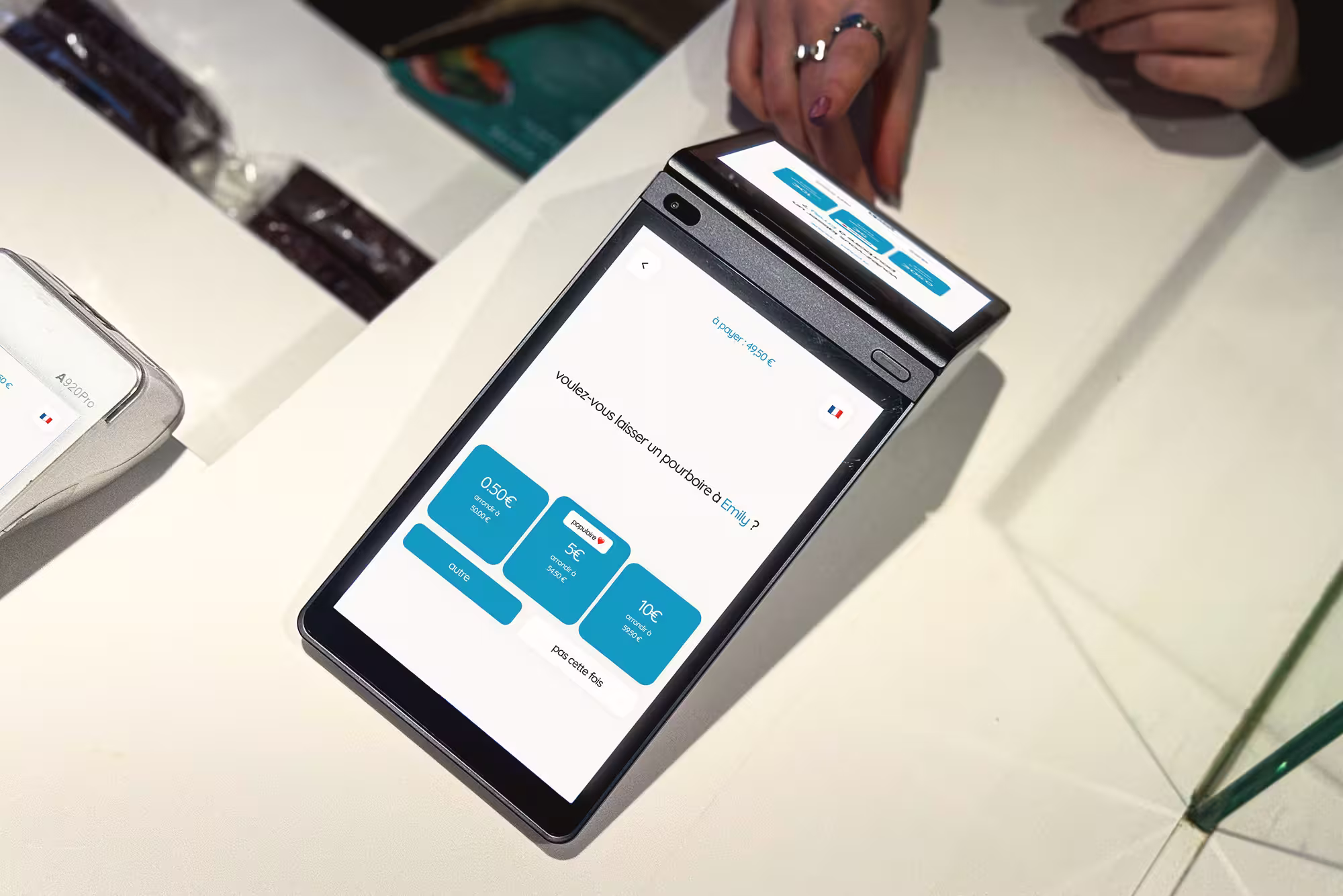 Absolument. Nos terminaux sont compatibles avec les logiciels de caisse et peuvent être connectés directement à votre comptoir ou borne. Ils prennent en charge les programmes de fidélité, les pourboires et le branding de votre établissement.